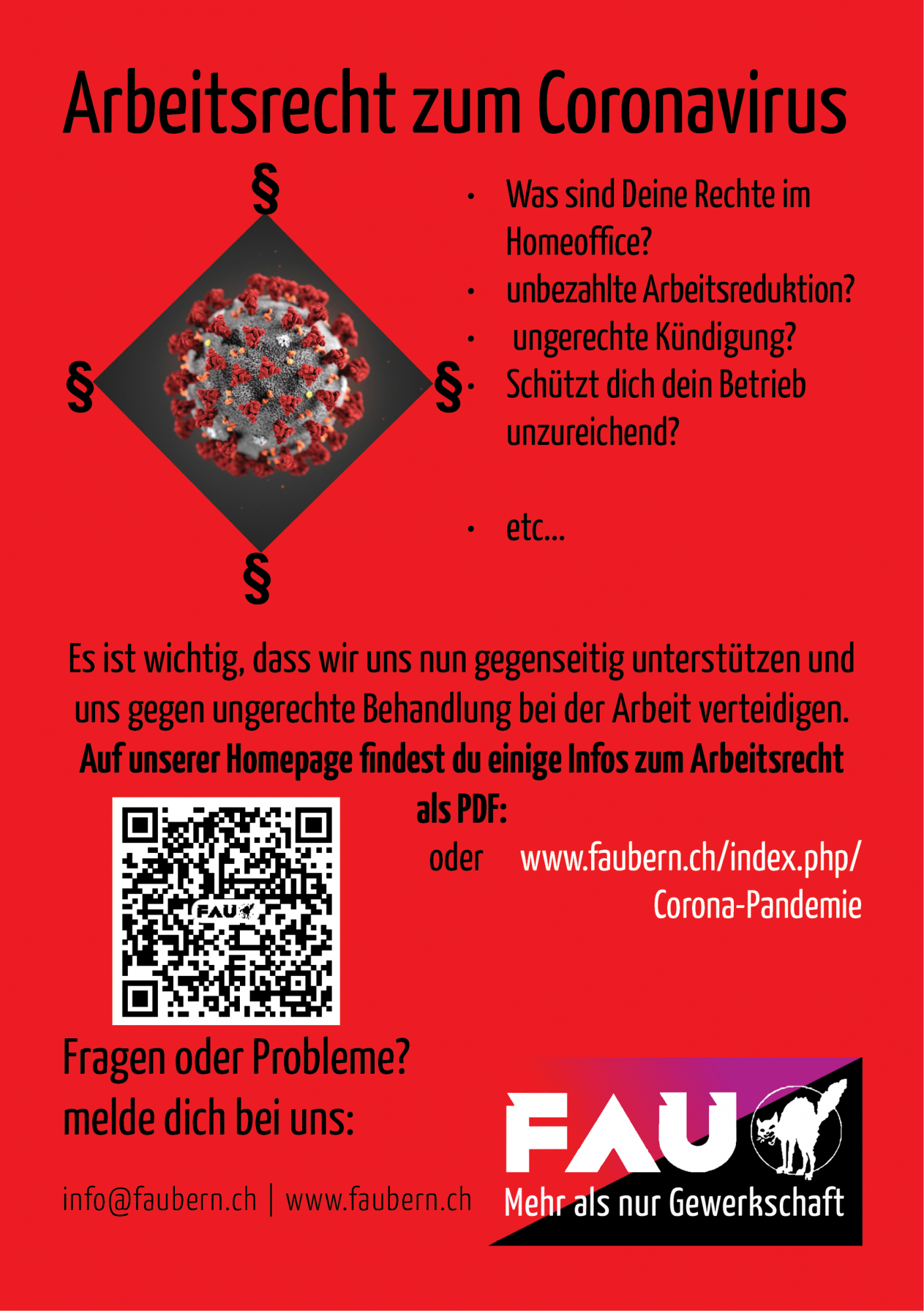 Wir müssen uns nun davor schützen, dass die Bosse versuchen, die Krise auf uns abzuwälzen. Hier findet ihr ein kurzes FAQ zu arbeitsrechtlichen Fragen als PDF, wie auch eine Broschüre zu Homeoffice.