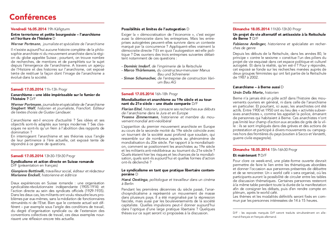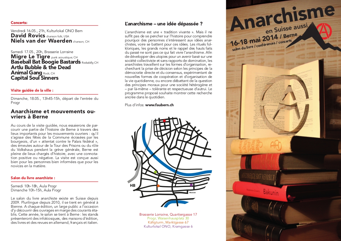 Au cours du mois de mai aura lieu un week-end sur le sujet "Anarchisme - en Suisse aussi". De ce week-end feront partie un salon du livre, divers débats et conférences, deux soirées de concerts ainsi qu'une visite guidée de la ville.