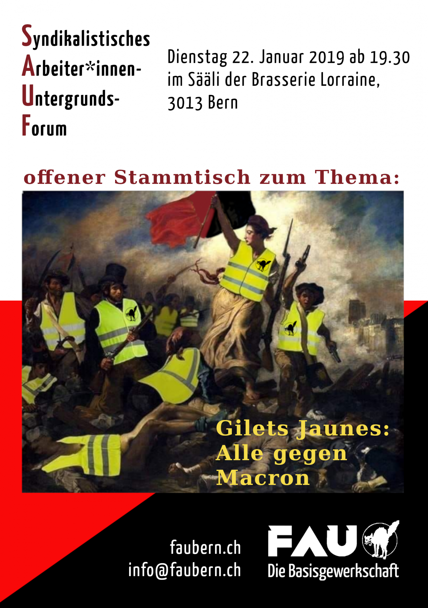 Jeden vierten Dienstag im Monat lädt die Basisgewerkschaft FAU Bern zu einem ungezwungenen Austausch, dem SAUF (Syndikalistisches Arbeiter*innen-Untergrunds-Forum) ein. Es soll eine Diskussionsplattform sein, welche ein Lernen von unten ermöglichen soll. Bei Bier, Eistee oder sonst was soll sich jeden Monat einem Thema gewidmet werden. Das SAUF ist keine Vortragsreihe, sondern ein ungezwungener Austausch untereinander. Komm doch mal vorbei, wir freuen uns.